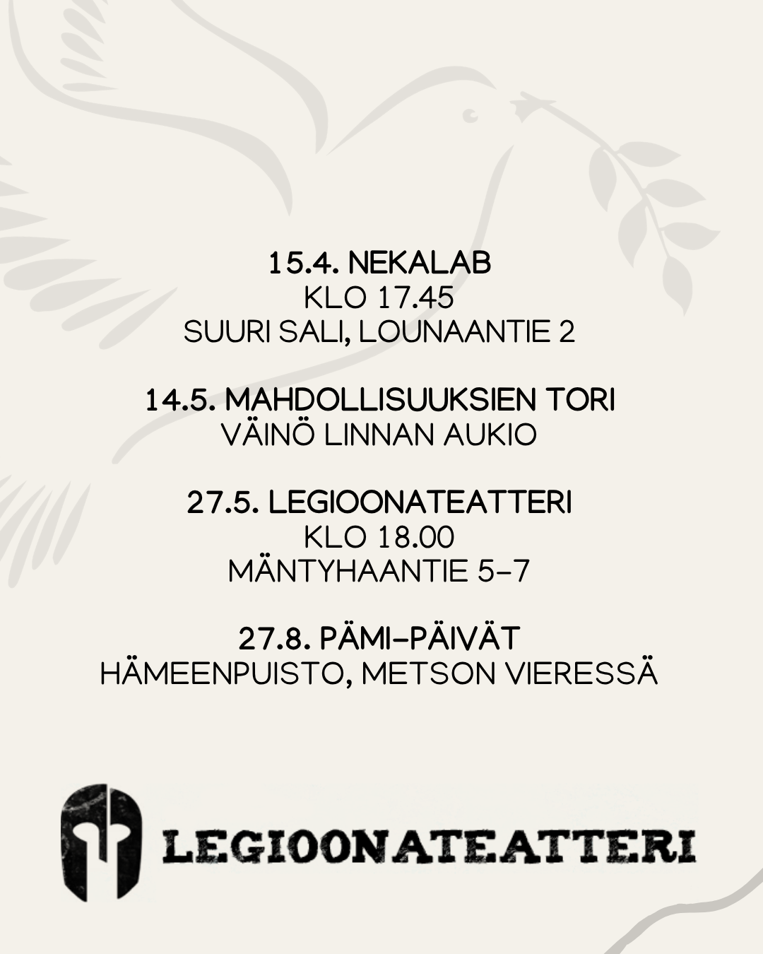Legioonateatterin rauhankuoro esiintyy rauhan, solidaarisuuden, yhdenvertaisuuden ja yhteisöllisyyden nimissä. Tarkoituksena on näinä synkkinä aikoina tuoda toivoa ihmisten sydämiin ja elvyttää rauhanlauluperinnettä.